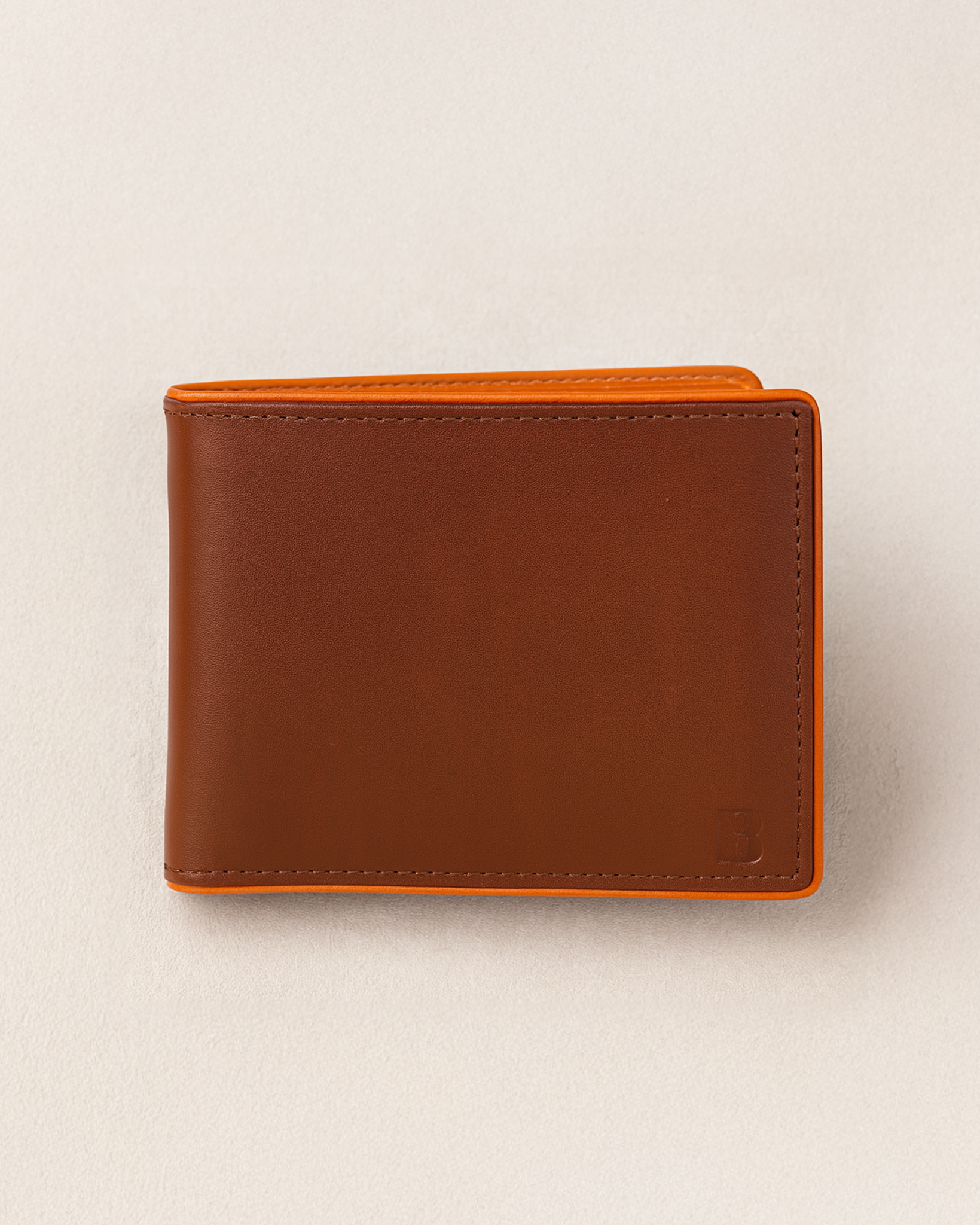 PREMIUM DESIGN: Crafted from genuine leather with a sophisticated brown exterior and vibrant orange interior, featuring classic bifold styling