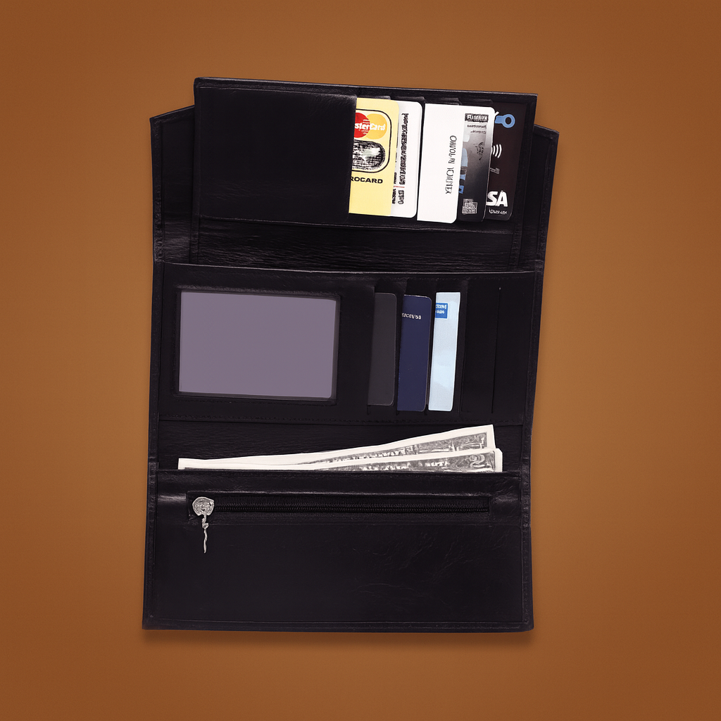 Black two-fold wallet with 1 separate card holder, has 1 Zip